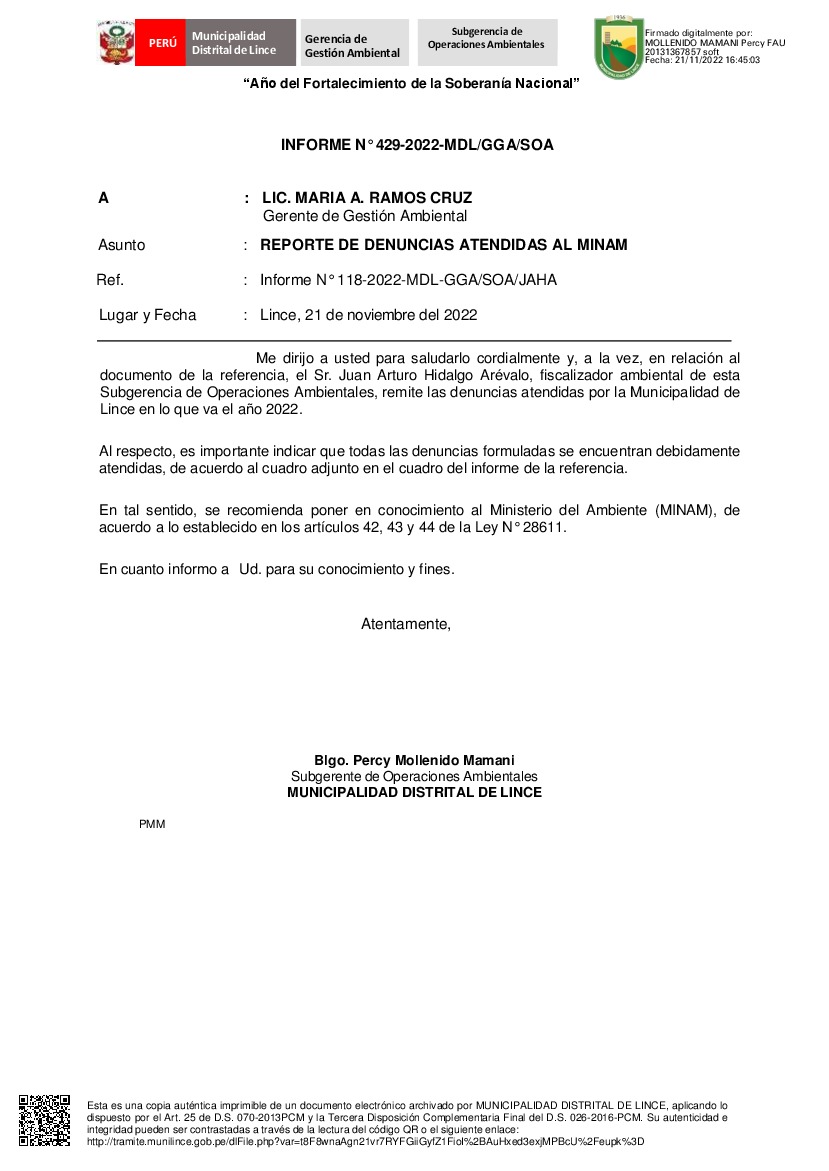La entidad remite al Ministerio del Ambiente información sobre las denuncias ambientales en cumplimiento de lo establecido en el Decreto Legislativo N° 1055 que modifica el artículo 43° de la Ley N° 28611, que indica que "Las entidades deberán enviar anualmente un listado con las denuncias recibidas y soluciones alcanzadas, con la finalidad de hacer pública esta información a la población a través del SINIA".