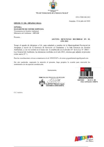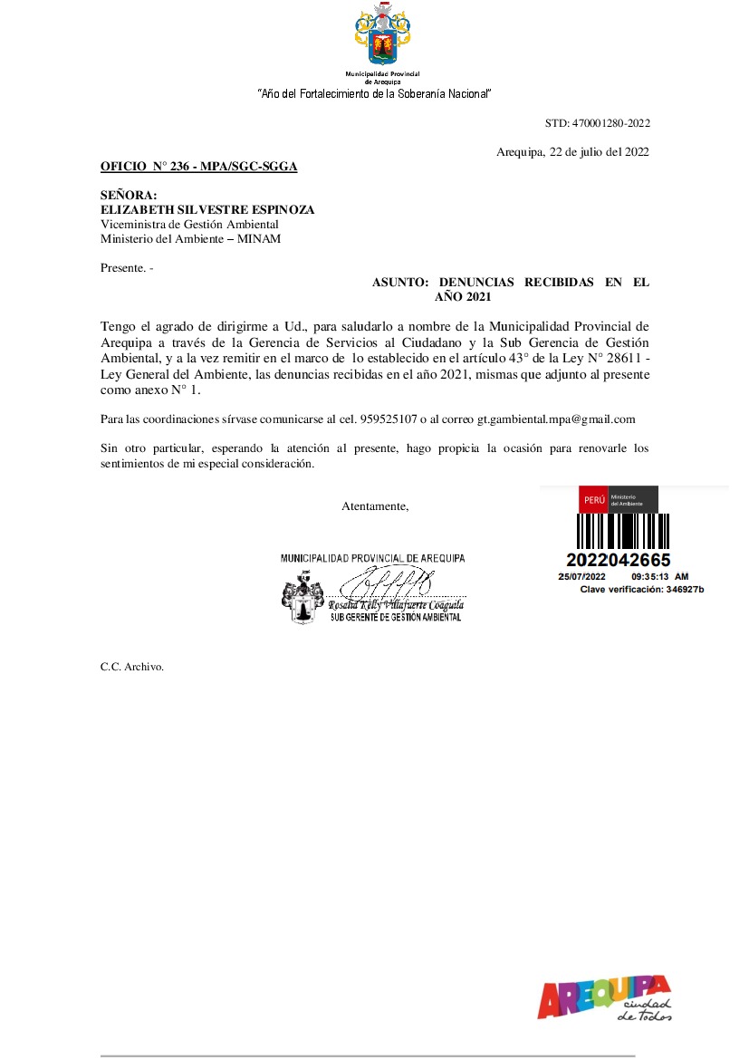 La entidad remite al Ministerio del Ambiente información sobre las denuncias ambientales en cumplimiento de lo establecido en el Decreto Legislativo N° 1055 que modifica el artículo 43° de la Ley N° 28611, que indica que "Las entidades deberán enviar anualmente un listado con las denuncias recibidas y soluciones alcanzadas, con la finalidad de hacer pública esta información a la población a través del SINIA".