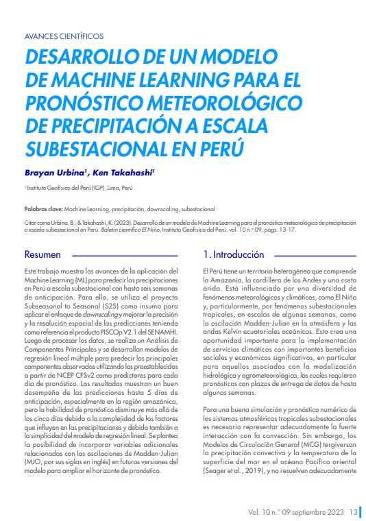 Este trabajo muestra los avances de la aplicación del Machine Learning (ML) para predecir las precipitaciones en Perú a escala subestacional con hasta seis semanas de anticipación. Para ello, se utiliza el proyecto Subseasonal to Seasonal (S2S) como insumo para aplicar el enfoque de downscaling y mejorar la precisión y la resolución espacial de las predicciones teniendo como referencia el producto PISCOp V2.1 del SENAMHI. Luego de procesar los datos, se realiza un Análisis de Componentes Principales y se desarrollan modelos de regresión lineal múltiple para predecir los principales componentes observados utilizando los preestablecidos a partir de NCEP CFSv2 como predictores para cada día de pronóstico. Los resultados muestran un buen desempeño de las predicciones hasta 5 días de anticipación, especialmente en la región amazónica, pero la habilidad de pronóstico disminuye más allá de los cinco días debido a la complejidad de los factores que influyen en las precipitaciones y debido también a la simplicidad del modelo de regresión lineal. Se plantea la posibilidad de incorporar variables adicionales relacionadas con las oscilaciones de Madden-Julian (MJO, por sus siglas en inglés) en futuras versiones del modelo para ampliar el horizonte de pronóstico.