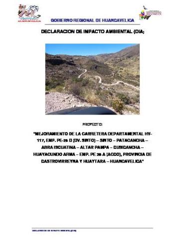 DIA: “MEJORAMIENTO DE LA CARRETERA DEPARTAMENTAL HV- 117, EMP. PE-28 D (DV. SINTO) – SINTO – PATACANCHA – ABRA ISCUATINA – ALTAR PAMPA – CUSICANCHA – HUAYACUNDO ARMA – EMP. PE 28 A (ACCO), PROVINCIA DE CASTROVIRREYNA Y HUAYTARA – HUANCAVELICA”