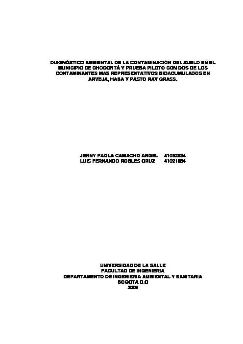 DIAGNÓSTICO AMBIENTAL DE LA CONTAMINACIÓN DEL SUELO EN EL MUNICIPIO DE CHOCONTÁ Y PRUEBA PILOTO CON DOS DE LOS CONTAMINANTES MAS REPRESENTATIVOS BIOACUMULADOS EN ARVEJA, HABA Y PASTO RAY GRASS.