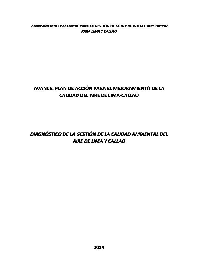 El Plan de Acción para el Mejoramiento de la Calidad del Aire de Lima-Callao 2019-2023 tiene como finalidad proponer mecanismos concretos y efectivos para la mejora de la calidad del aire de Lima y Callao, planteando acciones bajo el principio de objetivos compartidos y roles diferenciados. Por tanto, el presente documento “Diagnóstico de la gestión de la calidad del aire de Lima-Callao” establecerá la línea base para entender la problemática de la calidad del aire de la ciudad así como orientará la toma de decisiones hacia la formulación de las estrategias de intervención del mencionado Plan.