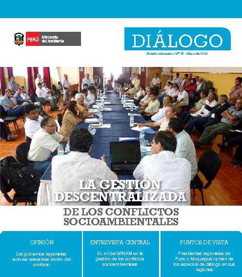 El presente número de Diálogo está dedicado a la gestión descentralizada de los conflictos socioambientales. Tenemos una entrevista con el Ministro del Ambiente Manuel Pulgar-Vidal, quien destaca el rol del sector en la gestión de los conflictos socioambientales, quien ofrece un panorama de cómo se está organizando el MINAM con miras a consolidar una mejor articulación con las regiones. Además, presentamos un artículo de opinión sobre la participaciónde los gobiernos regionales en los espacios de diálogo; una breve reseña de la situación actual de las principales mesas de diálogo en las que interviene el MINAM. Se presenta la estrategia sectorial para la prevención de los conflictos, que centra su accionar en el funcionamiento de Redes de Alerta Temprana (RET), herramienta que ha sidoaprobada con RM N° 079-2014-MINAM, que contiene los Lineamientos de Alerta Temprana de Conflictos Socioambientales, así como en la plataforma informática. A la vez, se presentan interesantes entrevistas a dos Presidentes regionales, de Moquegua Martín Vizcarra y de Puno Mauricio Rodriguez. Finalmente, se expone el artículo de los proyectos de inversión pública en material ambiental, entre otras secciones.