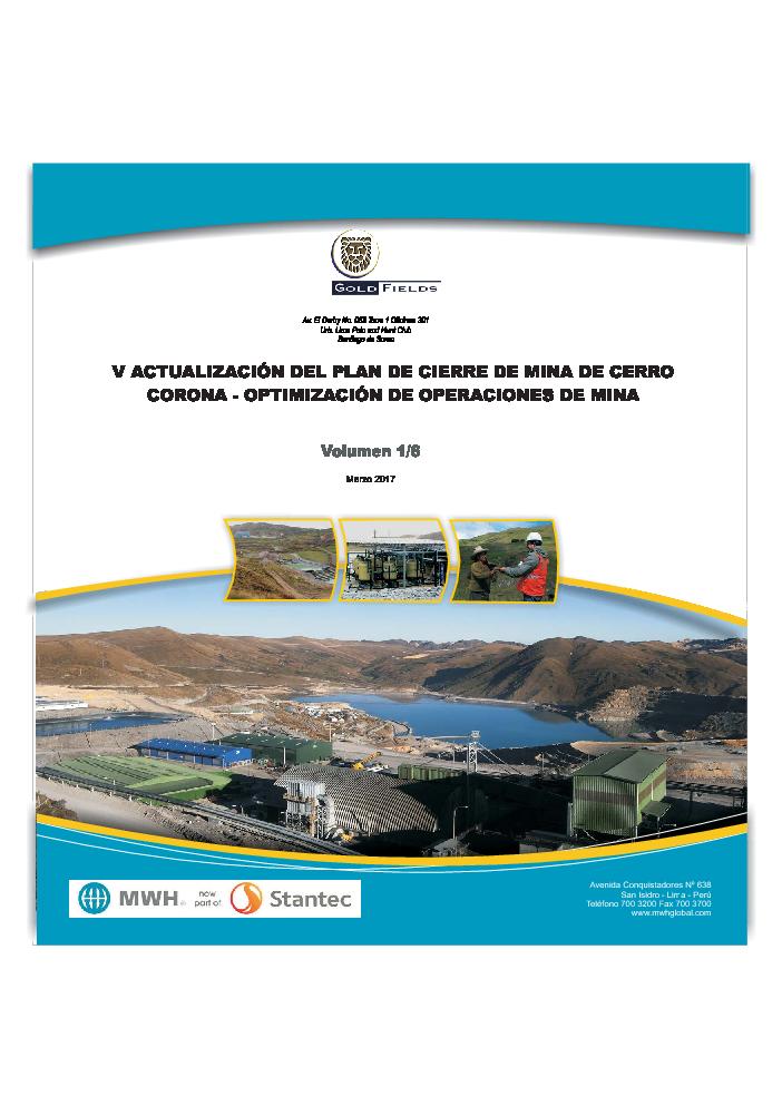 El presente estudio desarrolla la V Actualización del Plan de Cierre de Mina (PCM) de Cerro Corona –Optimización de Operaciones de Mina de Gold Fields La Cima S.A. (en adelante GFLC); el cual ha sido desarrollado para las operaciones que se desarrollan en la Unidad Minera Cerro Corona, la cual está ubicada en la zona sierra del país (distrito de Hualgayoc, provincia de Hualgayoc, departamento de Cajamarca) y en adelante se denominará “Unidad Minera”; y la otra, que concierne a las instalaciones de almacenamiento y embarque de concentrado, situadas en el distrito de Salaverry, provincia de Trujillo, departamento de La Libertad, que en adelante se le denominará “Instalaciones en Salaverry”.