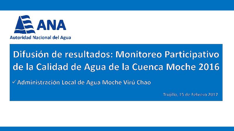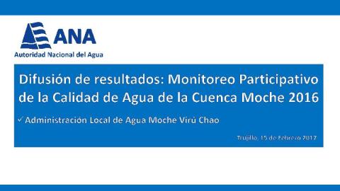 Esta presentación fue realizada por la Blga Miury Ana Malpica Maguiña, especialista de calidad de agua de la Administración Local de Agua Moche-Virú-Chao, que se llevó a cabo el día miércoles 15 de febrero en el Auditorio de la Escuela de Posgrado de la Universidad Nacional de Trujillo donde se realizó la difusión de resultados del Monitoreo Participativo de la Calidad de Agua de la Cuenca Moche 2016.