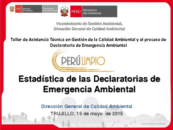Esta presentación se llevó el 15 de mayo del 2015 en el TALLER “ASISTENCIA TÉCNICA EN GESTIÓN DE LA CALIDAD AMBIENTAL Y EL PROCESO DE LA DECLARATORIA DE EMERGENCIA AMBIENTAL” en el auditorio del Centro Regional de Capacitación del Gobierno Regional La Libertad en la ciudad de Trujillo.