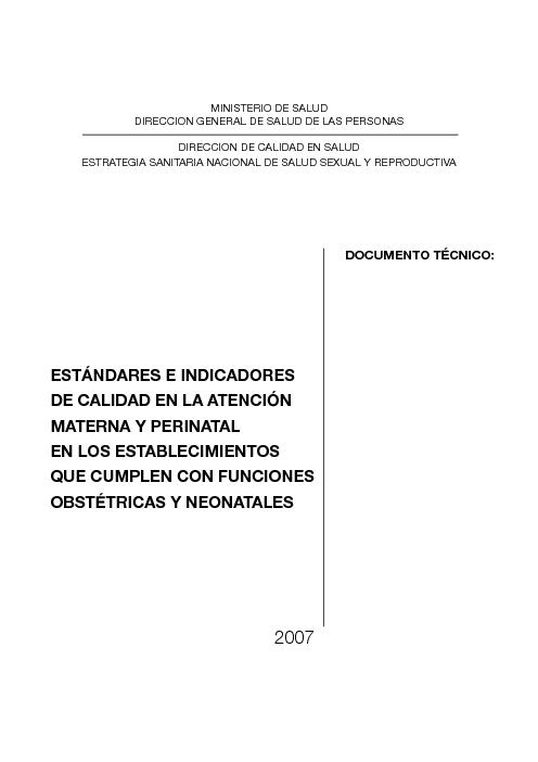 Este documento técnico: Estándares e Indicadores de calidad en la atención materna y perinatal en los establecimientos que cumplen con funciones obstétricas y neonatales, es aprobado con Resolución Ministerial N° 142-2007/MINSA. Tiene como finalidad contribuir a mejorar la calidad de atención a través del cumplimiento de los estándares e indicadores de calidad en la atención materna y perinatal en los servicios de salud que sirvan de base para un sistema de monitoreo permanente.