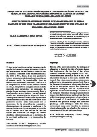 El objetivo del estudio, es analizar las estrategias de adaptación frente a los riesgos del cambio climático que implementan las familias del Centro Poblado de Huancho - Huancané - Perú, realizado durante el año 2010 y 2011, dentro de su ciclo productivo interno, así como las estrategias de articulación con el entorno social. La investigación, tiene un carácter no experimental, transversal, cualitativo y de interpretación, de nivel micro; dado su carácterde caso, la etnografía, se configura como el método adecuado para caracterizar las estrategias de adaptación que se vienen implementando frente a los efectos del cambio climático. Los resultados del estudio son: las estrategias de adaptación frente a los riesgos del cambio climático que implementan las familias rurales altiplánicas dentro de su ciclo productivo interno, están relacionadas con el incremento de la diversificación productiva, almacenamiento de recursos y productos y la