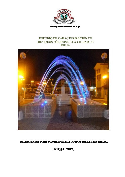 El presente informe, expone los resultados y procedimientos del Estudio de Caracterización de los Residuos Sólidos Domiciliarios, realizados en la ciudad de Rioja, Provincia de Rioja, Región San Martín, con una duración de 08 días; iniciándose del 20 al 27 de abril de 2012.