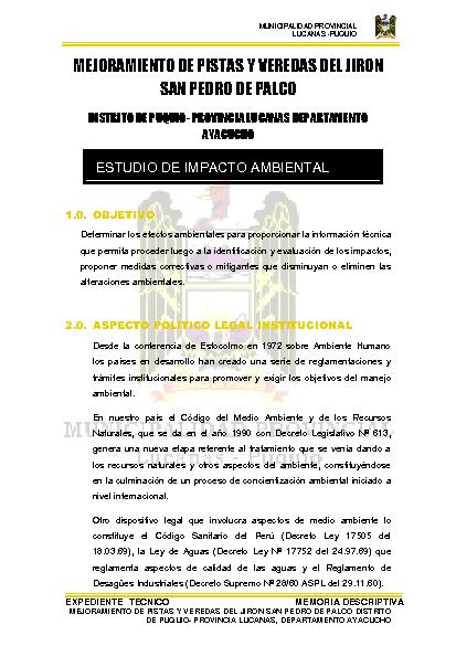 La Municipalidad Provincial de Lucanas Puquio, viene ejecutando diferentes obras en el distrito y en toda la Provincia de Lucanas, en las obras de Mejoramiento de pistas y veredas en la calle de San Pedro de Palco , ambas Obras que se vienen ejecutando, con el Objetivo de determinar los efectos ambientales para proporcionar la informacion tecnica que permita procedern luego a la identificacion y evaluacion de los impactos proponer medidas correctivas que disminuyan la alteracion ambiental.