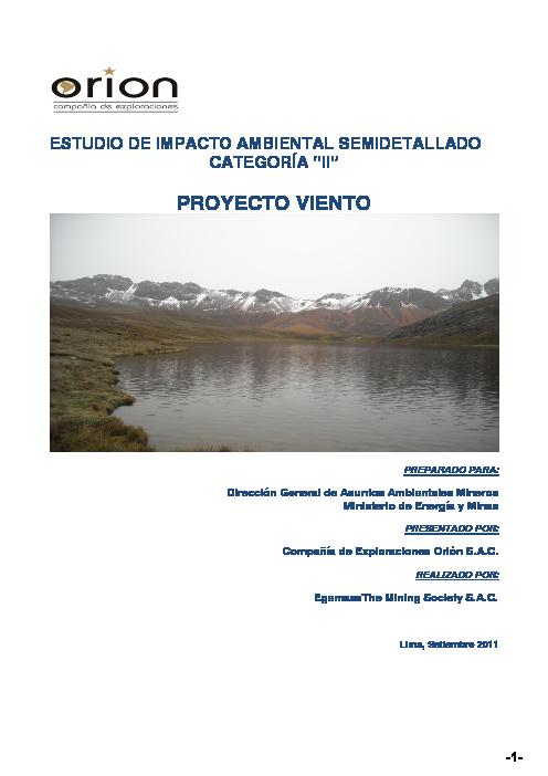 Compañía de Exploraciones Orión S.A.C (ORIÓN); presentó el Estudio de Impacto Ambiental Semi-detallado (EIA-sd) denominado “Viento”; el cual está localizado geográficamente en el Departamento de Lima, Provincias de Oyón y Huaura, distritos de Naván, Caujul y Ámbar.
