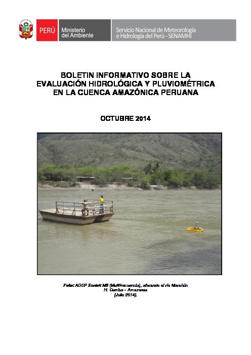 El presente documento técnico “Evaluación hidrológica y pluviométrica de la cuenca amazónica peruana que es elaborado por la Dirección General de Hidrología y Recursos Hídricos del SENAMHI, se enmarca dentro de las actividades operativas de la Vigilancia Hidrológica Nacional que realiza el SENAMHI en cumplimiento de sus funciones y competencia. En este ejemplar de noviembre-2014 se presenta el análisis y discusión del comportamiento de las precipitaciones y los caudales, para el Año Hidrológico 2014-2015, en las principales cuencas de esta vasta región amazónica, utilizando como insumo la información observada en las estaciones de medición que administra el SENAMHI.