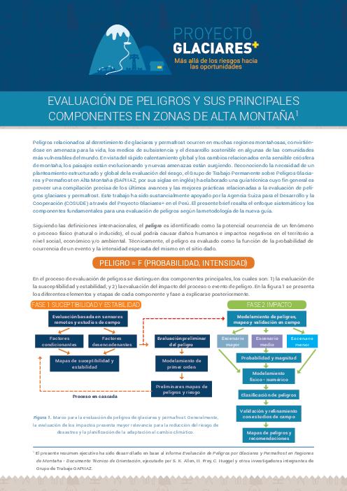 Peligros relacionados al derretimiento de glaciares y permafrost ocurren en muchas regiones montañosas, convirtiéndose en amenaza para la vida, los medios de subsistencia y el desarrollo sostenible en algunas de las comunidades más vulnerables del mundo. En vista del rápido calentamiento global y los cambios relacionados en la sensible criósfera de montaña, los paisajes están evolucionando y nuevas amenazas están surgiendo. Reconociendo la necesidad de un planteamiento estructurado y global de la evaluación del riesgo, el Grupo de Trabajo Permanente sobre Peligros Glaciares y Permafrost en Alta Montaña (GAPHAZ, por sus siglas en inglés) ha elaborado una guía técnica cuyo fin general es proveer una compilación precisa de los últimos avances y las mejores prácticas relacionadas a la evaluación de peligros glaciares y permafrost. Este trabajo ha sido sustancialmente apoyado por la Agencia Suiza para el Desarrollo y la