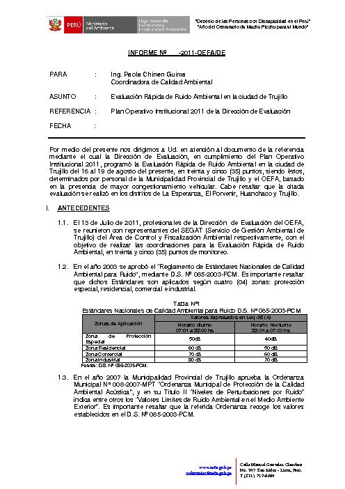 El Organismo de Evaluación y Fiscalización Ambiental programó la Evaluación Rápida de Ruido Ambiental en la ciudad de Trujillo del 16 al 19 de agosto del 2011, en treinta y cinco (35) puntos, siendo éstos, determinados por personal del Servicio de Gestión Ambiental de Trujillo y el OEFA, basado en la presencia de mayor congestionamiento vehicular. Cabe resaltar que la citada evaluación se realizó en los distritos de La Esperanza, El Porvenir, Huanchaco y Trujillo.Los resultados obtenidos responden principalmente a la generación de ruidos molestos producto del tránsito de transporte público, vehículos taxis, particulares, camionetas, transporte de alto tonelaje y transporte interprovincial, ya que gran parte de este parque automotor se encuentra en la parte céntrica de la ciudad de Trujillo ocasionando un congestionamiento en las vías públicas.