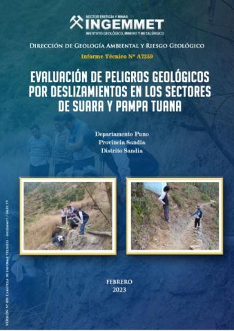 El presente informe técnico es el resultado de la evaluación de peligros geológicos por movimientos en masa, realizados en los sectores de Suara y Pampa Tuana, en el distrito y provincia de Sandía, departamento Puno. Con este trabajo el Instituto Geológico Minero y Metalúrgico – INGEMMET, cumple con una de sus funciones que consiste en brindar asistencia técnica en peligros geológicos en los tres niveles de gobierno.