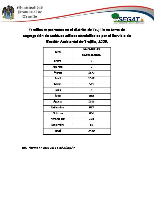 En el 2009, el Servicio de Gestión Ambiental de Trujillo logró capacitar a un total de 7470 familias sobre como segregar sus residuos solidos.