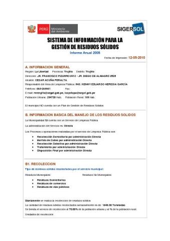 Formulario del Sistema de Información para la Gestión de Residuos Sólidos, SIGERSOL gestión 2008 del Distrito de Trujillo