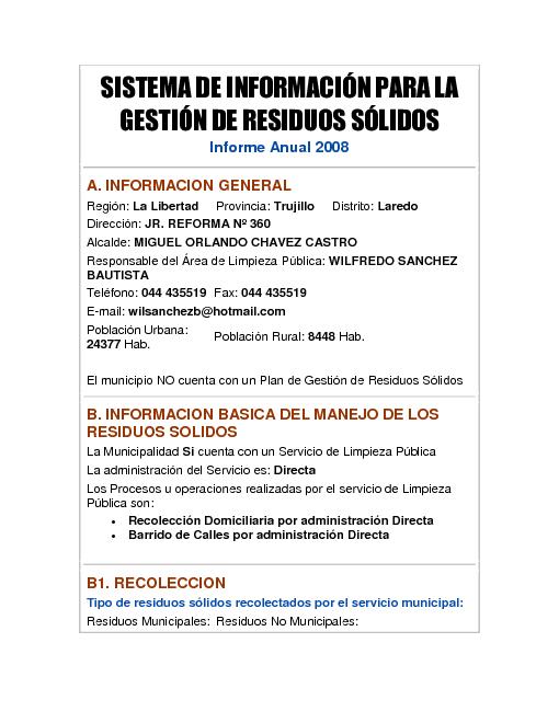 Formulario del Sistema de Información para la Gestión de Residuos Sólidos, SIGERSOL gestión 2008 del distrito de Laredo de la provincia de Trujillo, departamento La Libertad
