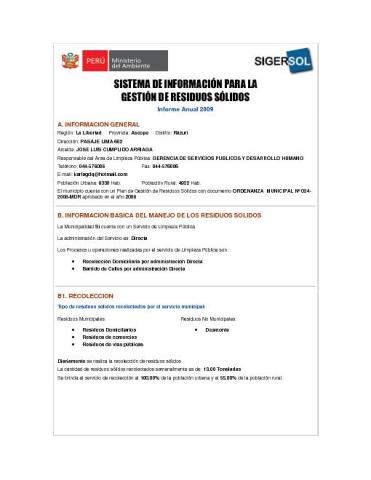 Formulario del Sistema de Información para la Gestión de Residuos Sólidos, SIGERSOL gestión 2009 del distrito de Rázuri de la provincia de Ascope, departamento La Libertad