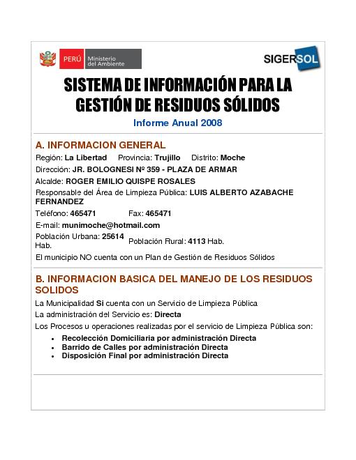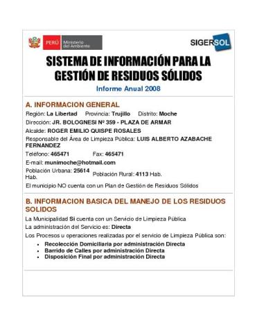 Formulario del Sistema de Información para la Gestión de Residuos Sólidos, SIGERSOL gestión 2008 del distrito de Moche de la provincia de Trujillo, departamento La Libertad
