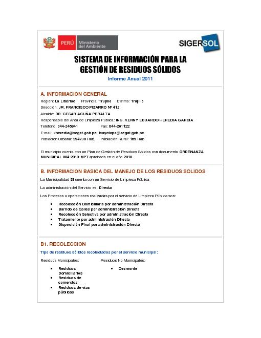 Formulario del Sistema de Información para la Gestión de Residuos Sólidos, SIGERSOL gestión 2011 del distrito de Trujillo