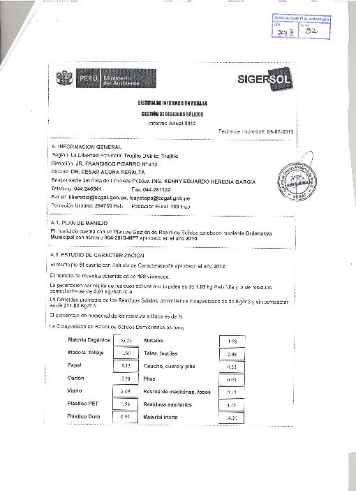 Formulario del Sistema de Información para la Gestión de Residuos Sólidos, SIGERSOL gestión 2012 del distrito de Trujillo
