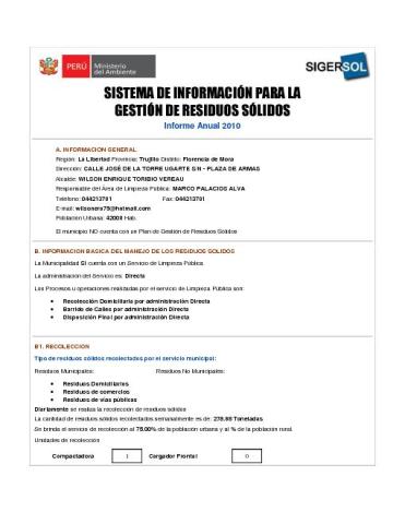 Formulario del Sistema de Información para la Gestión de Residuos Sólidos, SIGERSOL gestión 2010 del distrito Florencia de Mora, provincia de Trujillo, departamento La Libertad