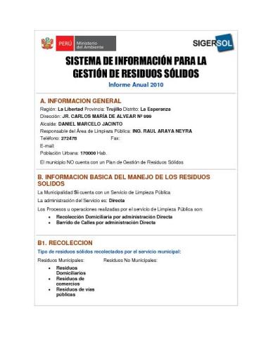 Formulario del Sistema de Información para la Gestión de Residuos Sólidos, SIGERSOL gestión 2010 del distrito La Esperanza, provincia de Trujillo, departamento La Libertad