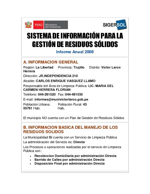 Formulario del Sistema de Información para la Gestión de Residuos Sólidos, SIGERSOL gestión 2008 del distrito de Víctor Larco de la provincia de Trujillo, departamento La Libertad