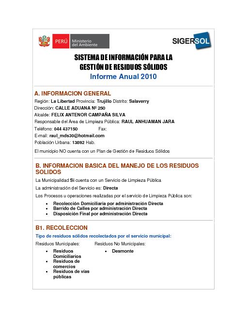 Formulario del Sistema de Información para la Gestión de Residuos Sólidos, SIGERSOL gestión 2010 del distrito Salaverry, provincia de Trujillo, departamento La Libertad