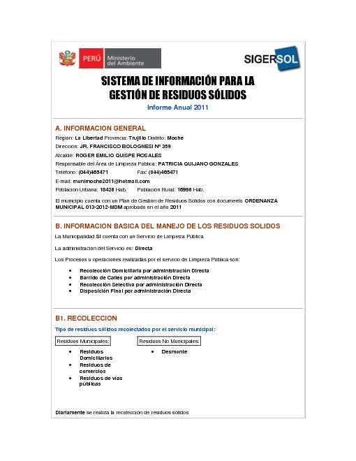 Formulario del Sistema de Información para la Gestión de Residuos Sólidos, SIGERSOL gestión 2011 del distrito de Moche, provincia de Trujillo, departamento La Libertad