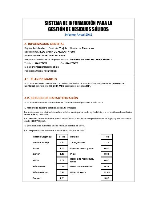 Formulario del Sistema de Información para la Gestión de Residuos Sólidos, SIGERSOL gestión 2012 del distrito La Esperanza, provincia de Trujillo, departamento La Libertad