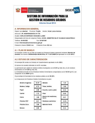 Formulario del Sistema de Información para la Gestión de Residuos Sólidos, SIGERSOL gestión 2012 del distrito Víctor Larco Herrera, provincia de Trujillo, departamento La Libertad