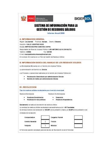 Formulario del Sistema de Información para la Gestión de Residuos Sólidos, SIGERSOL gestión 2008 del distrito de Chicama de la provincia de Ascope, departamento La Libertad