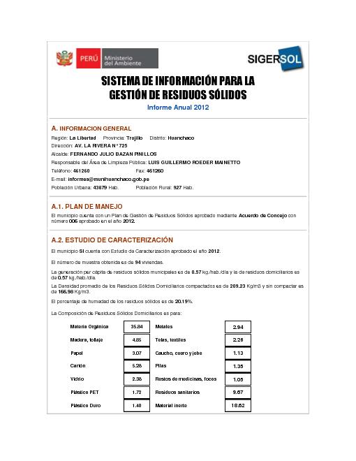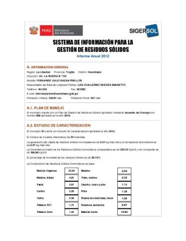 Formulario del Sistema de Información para la Gestión de Residuos Sólidos, SIGERSOL gestión 2012 del distrito de Huanchaco, provincia de Trujillo, departamento La Libertad