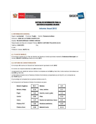 Formulario del Sistema de Información para la Gestión de Residuos Sólidos, SIGERSOL gestión 2012 del distrito Florencia de Mora, provincia de Trujillo, departamento La Libertad