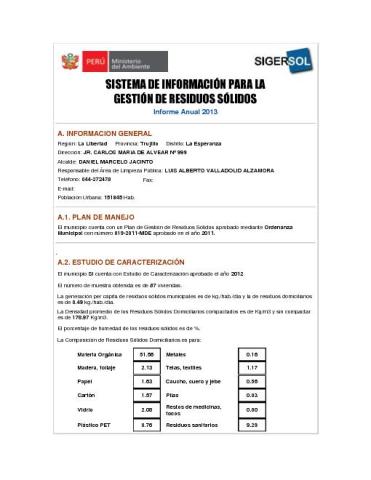 Formulario del Sistema de Información para la Gestión de Residuos Sólidos, SIGERSOL gestión 2013 del distrito de La Esperanza, provincia de Trujillo, departamento La Libertad