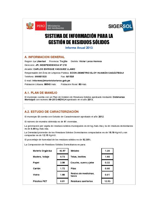 Formulario del Sistema de Información para la Gestión de Residuos Sólidos, SIGERSOL gestión 2013 del distrito de Victor Larco Herrera, provincia de Trujillo, departamento La Libertad