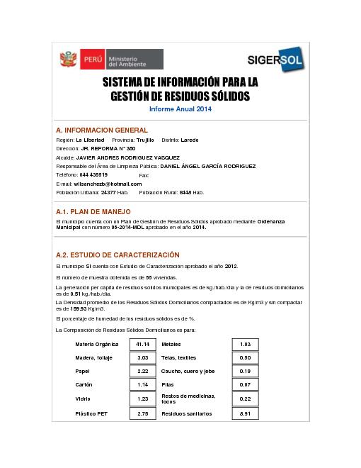 Formulario del Sistema de Información para la Gestión de Residuos Sólidos, SIGERSOL gestión 2014 del distrito de Laredo, provincia de Trujillo, departamento La Libertad