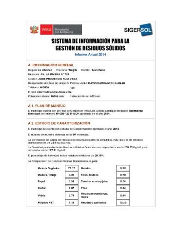Formulario del Sistema de Información para la Gestión de Residuos Sólidos, SIGERSOL gestión 2014 del distrito de Huanchaco, provincia de Trujillo, departamento La Libertad