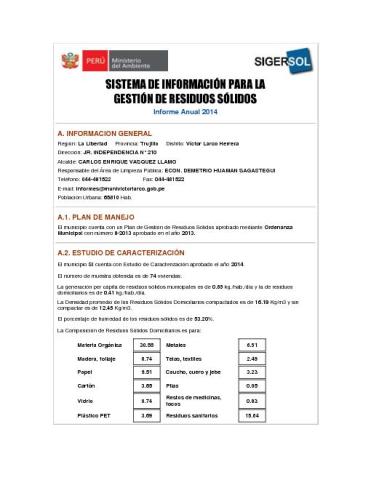 Formulario del Sistema de Información para la Gestión de Residuos Sólidos, SIGERSOL gestión 2014 del distrito de Víctor Larco Herrera, provincia de Trujillo, departamento La Libertad