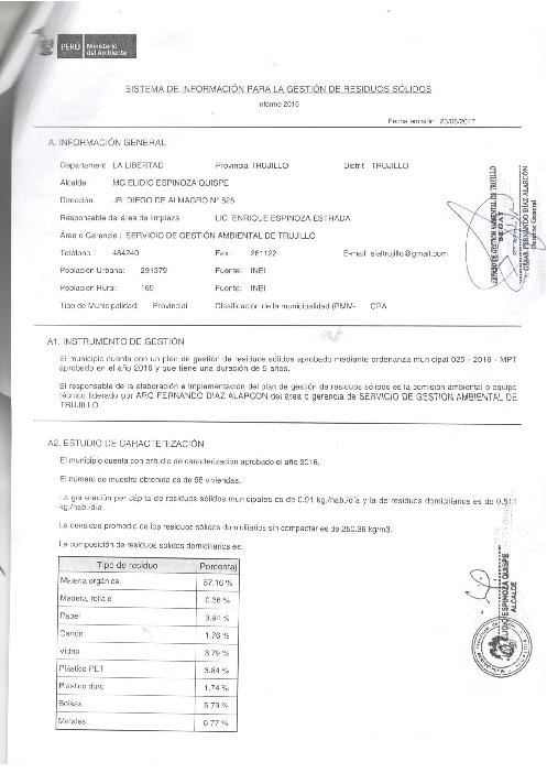 Formulario del Sistema de Información para la Gestión de Residuos Sólidos, SIGERSOL gestión 2016 del distrito de Trujillo, provincia de Trujillo, departamento La Libertad