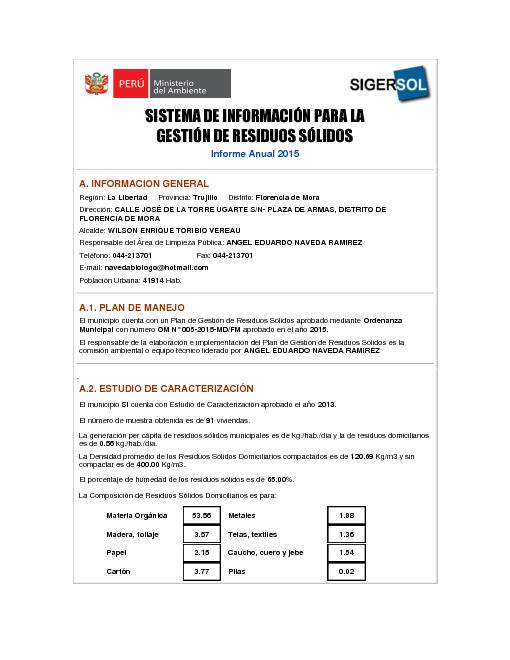 Formulario del Sistema de Información para la Gestión de Residuos Sólidos, SIGERSOL gestión 2015 del distrito de Florencia de Mora, provincia de Trujillo, departamento La Libertad