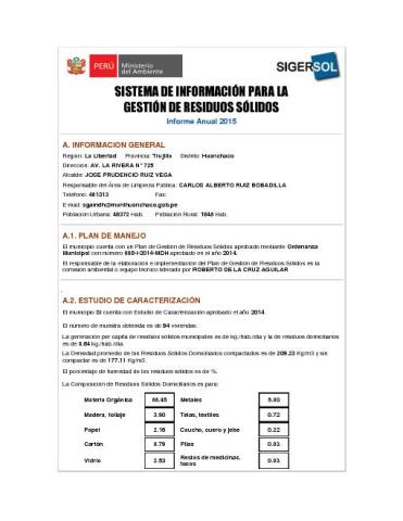Formulario del Sistema de Información para la Gestión de Residuos Sólidos, SIGERSOL gestión 2015 del distrito de Huanchaco, provincia de Trujillo, departamento La Libertad