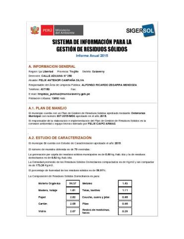 Formulario del Sistema de Información para la Gestión de Residuos Sólidos, SIGERSOL gestión 2015 del distrito de Salaverry, provincia de Trujillo, departamento La Libertad