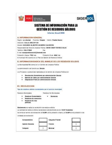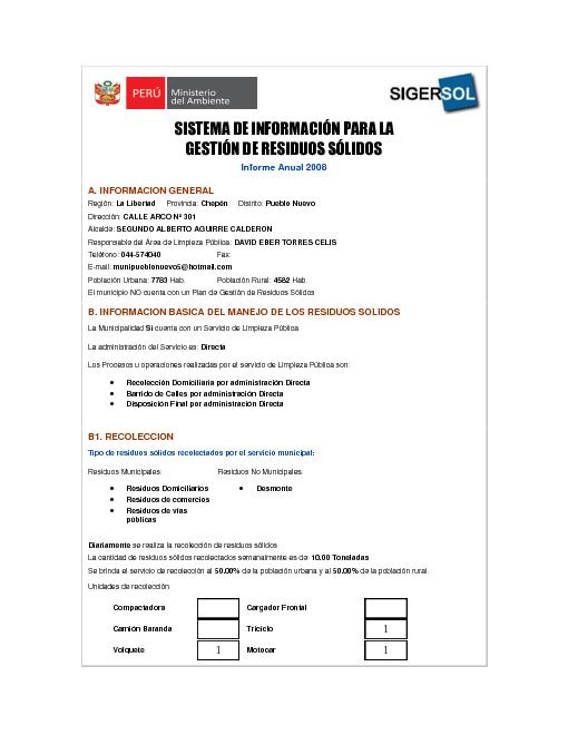 Formulario del Sistema de Información para la Gestión de Residuos Sólidos, SIGERSOL gestión 2008 del distrito de Pueblo Nuevo de la provincia de Chepén, departamento La Libertad