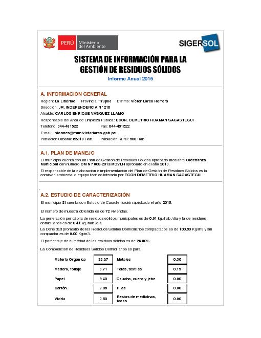 Formulario del Sistema de Información para la Gestión de Residuos Sólidos, SIGERSOL gestión 2015 del distrito de Víctor Larco Herrera, provincia de Trujillo, departamento La Libertad