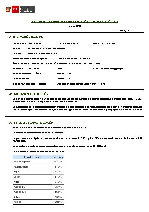 Formulario del Sistema de Información para la Gestión de Residuos Sólidos, SIGERSOL gestión 2016 del distrito de El Porvenir, provincia de Trujillo, departamento La Libertad
