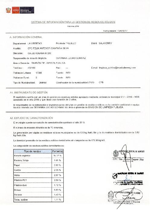 Formulario del Sistema de Información para la Gestión de Residuos Sólidos, SIGERSOL gestión 2016 del distrito de Salaverry, provincia de Trujillo, departamento La Libertad