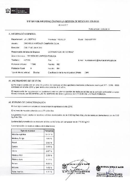 Formulario del Sistema de Información para la Gestión de Residuos Sólidos, SIGERSOL gestión 2017 del distrito de Salaverry, provincia de Trujillo, departamento La Libertad